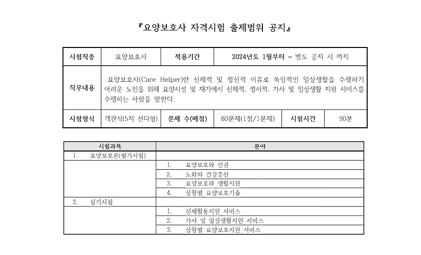 교육 범위 : 요양보호와 인권, 노화와 건강증진, 요양보호와 생활지원, 상황별 요양보호 기술