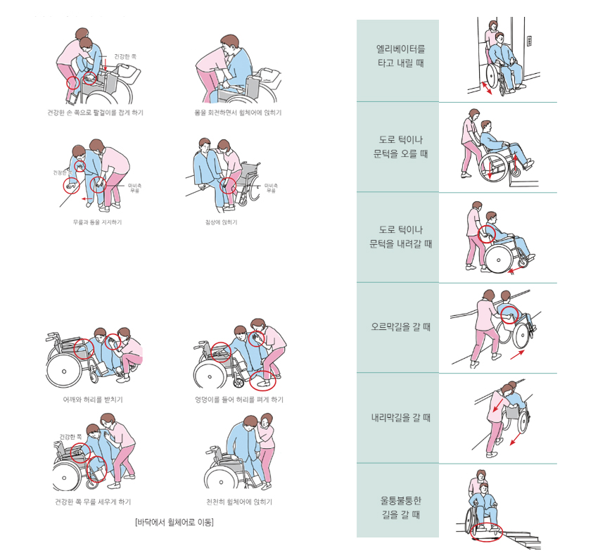 울퉁불퉁한 길을 갈 때 : 앞바퀴를 살짝 들어올린다. 휠체어를 약간 뒤로 젖힌 상태에서 이동한다. 앞바퀴가 지면에 닿으면 휠체어를 밀기도 힘들고 대상자가 진동을 많이 느낀다.