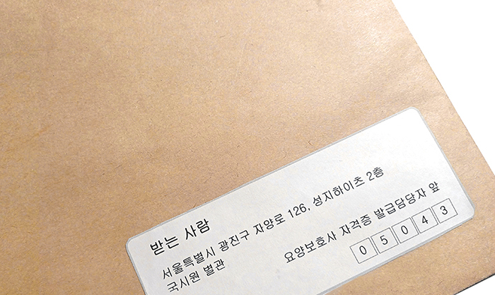 서류 봉투에 붙일 수 있는 보내는 사람, 받는 사람 주소는 요양보호사자격증 발급 신청서 출력시 국시원 사이트에서 함께 출력되기도 한다.