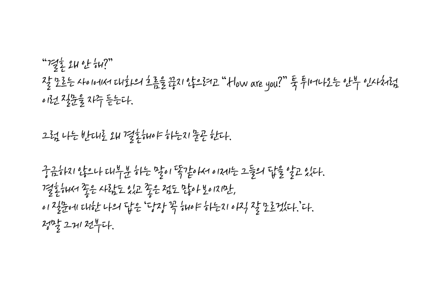 그렇게 보면 저자의 말처럼 왜 결혼해야 하는데? 라고 되돌아 물으면 선뜻 잘 대답할 수 있는 사람은 또 얼마나 있을까.