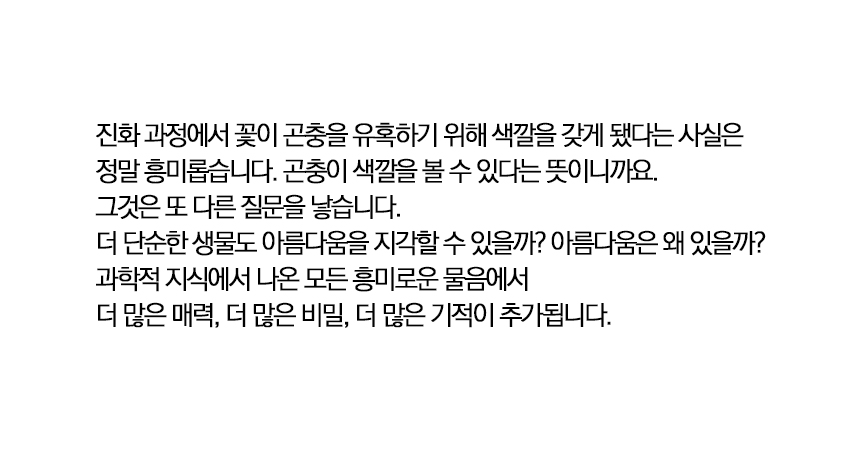 진화 과정에서 꽃이 곤충을 유혹하기 위해 색깔을 갖게 됐다는 사실은 정말 흥미롭습니다. 곤충이 색깔을 볼 수 있다는 뜻이니까요. 그것은 또 다른 질문을 낳습니다. 더 단순한 생물도 아름다움을 지각할 수 있을까? 아름다움은 왜 있을까?