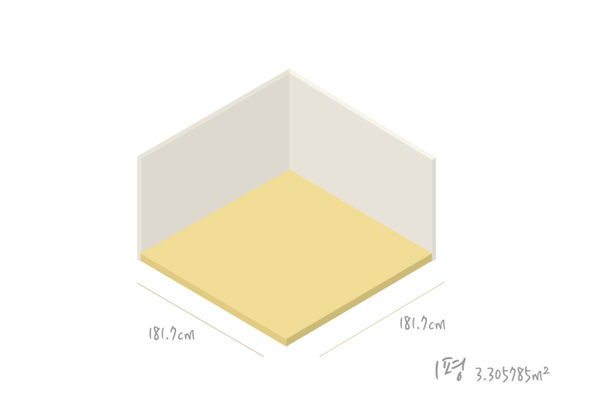 3.305785m²를 cm로 변환하면 약 181.7cm x 181.7cm 크기가 1평이다.