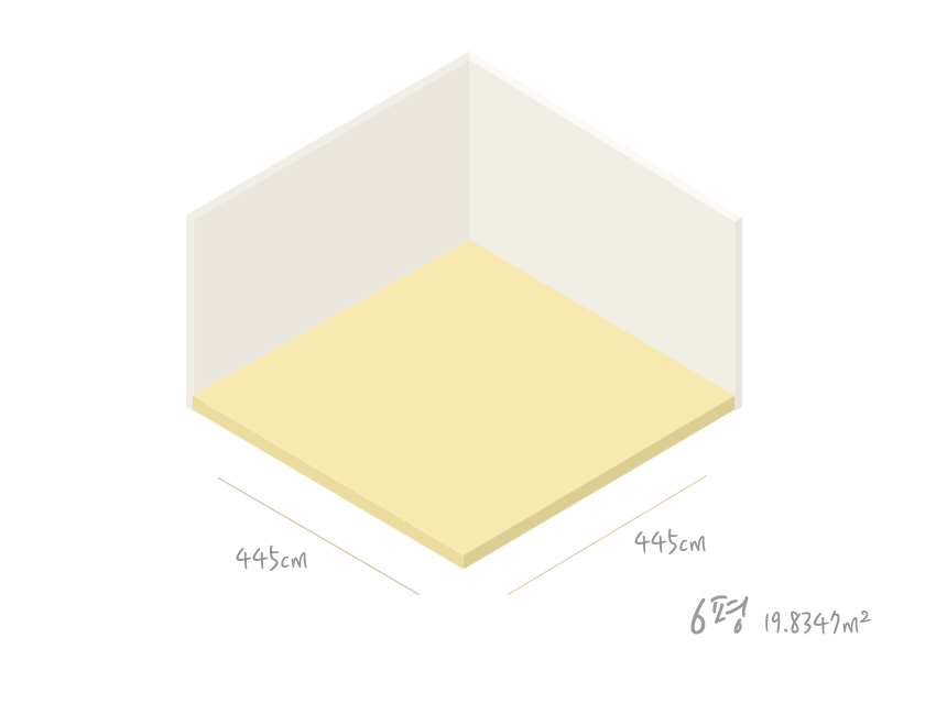 6평은 19.8347m²며 cm로 변환하면 약 445 x445 cm 크기다.