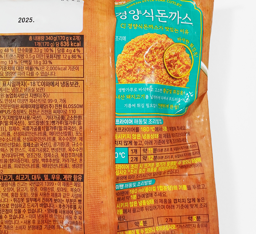 총 340g에 1,272kcal고 봉지를 열면 비교적 넓고 큼직한 돈까스만 2개 들어있다.