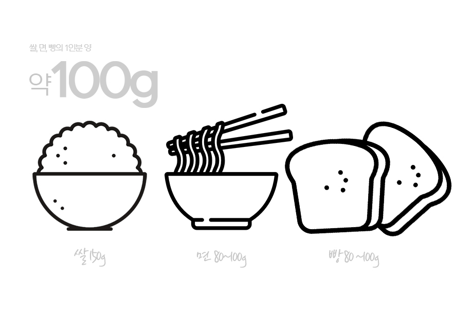 개개인의 한끼 식사량과 기호 등에 따라 다를 수 있지만 보통 익힌 밥, 삶은 국수, 구운 빵 등의 1인분은 100g 정도로 보면 적당하다.