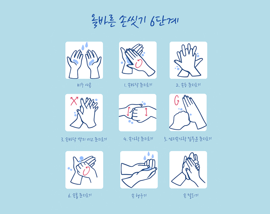 손을 씻을 때는 비누칠만 한 후 대강 헹구지 않고 올바른 손씻기 6단계 등을 통해서 꼼꼼이 15~30초는 씻어야 세균이 손에 남아있지 않는다.